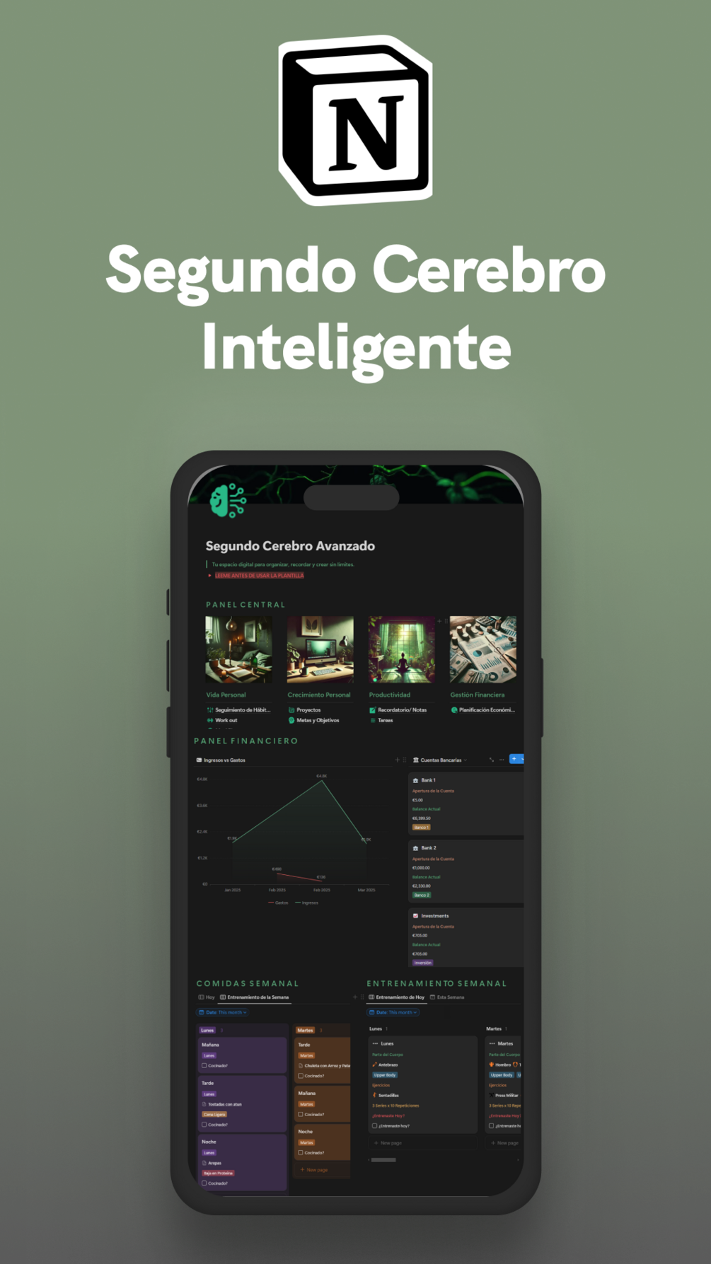 - Un espacio minimalista dividido en 5 secciones clave: Tareas, Proyectos, Finanzas, Hábitos y Notas.